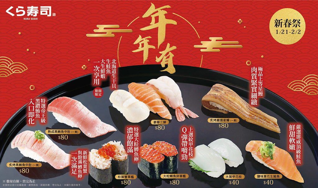「藏壽司」在1/21~2/2新春期間推出了8款期間限定的壽司,這個很應景耶!到藏壽司吃好魚,就可以年年有餘~