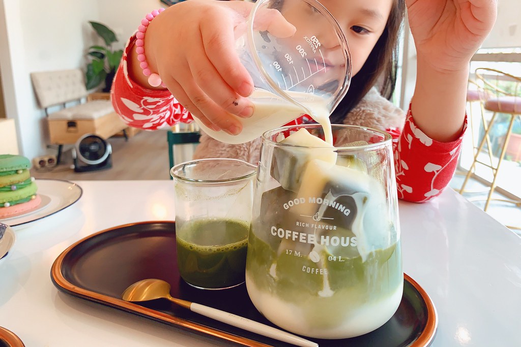 一般小孩子多半不敢吃抹茶,不過小櫻桃還滿愛的,靜岡抹茶味道比宇治抹茶來的清幽一點,苦韻和茶香也都相對比較柔順…