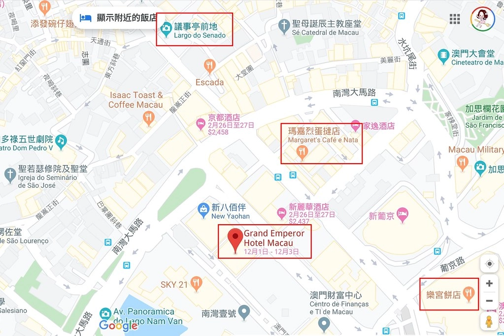著名的「瑪嘉烈蛋撻」也不遠,而且我們第二天走路到樂宮餅店買腰果曲奇餅也滿近的…