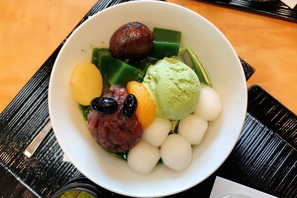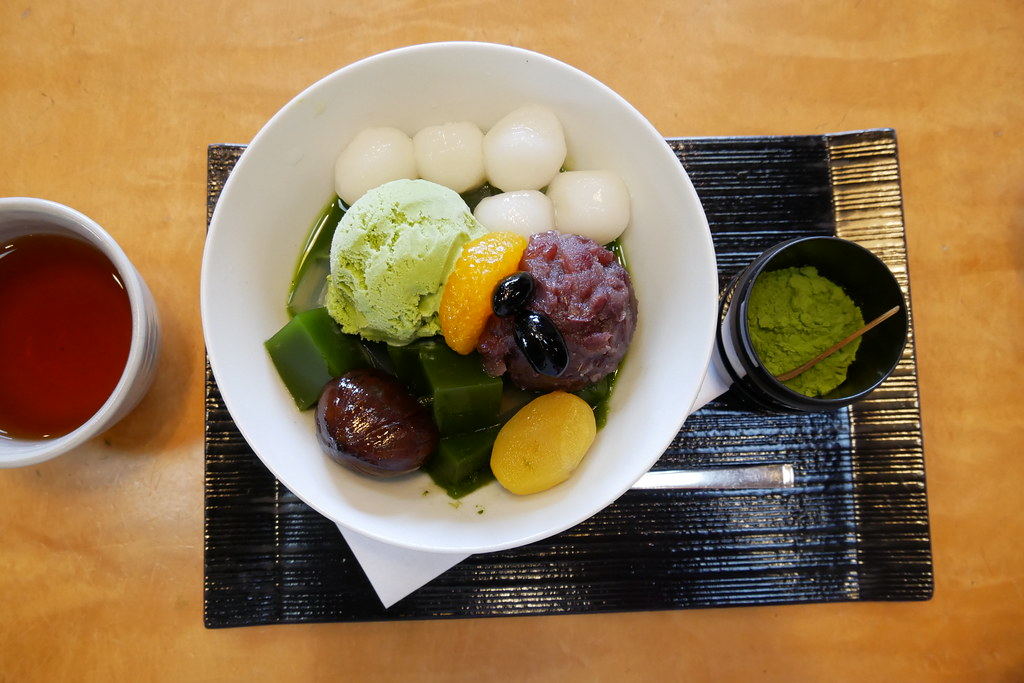 裡面除了有寒天之外,還有白玉、栗子、黑豆、紅豆、橙片和抹茶冰淇淋,完完全全都是我的菜…