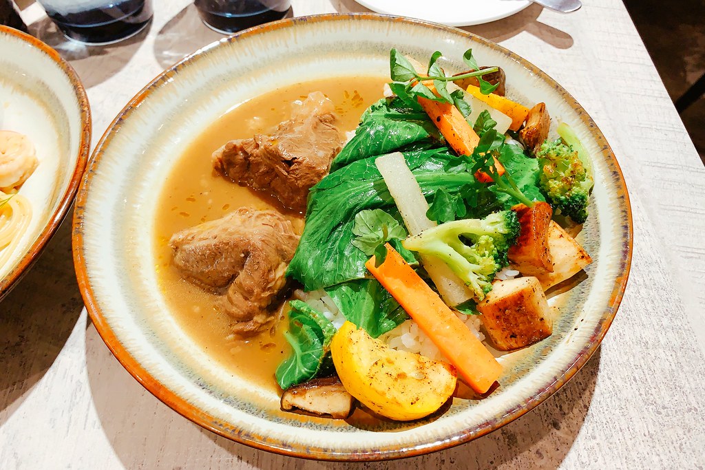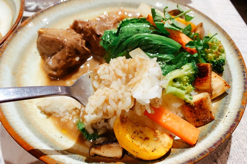 我喜歡這道裡面的蔬菜,蔬菜的份量很多,搭配的醬汁和白飯吃,真的好好吃啊!