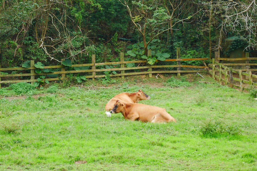 停好車之後直接往「牧場生態區」的方向走(走斜坡上去就對了),抵達上面就看到兩隻牛牛,這裡就是飛牛牧場的廣告…