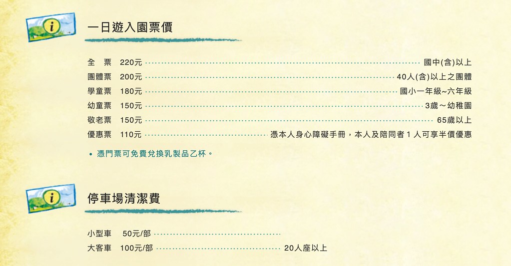 為了避免小櫻桃覺得不公平,所以我們就帶她來了,附上門票收費方式給大家參考,門票可以兌換園區裡販售的乳製品哦!