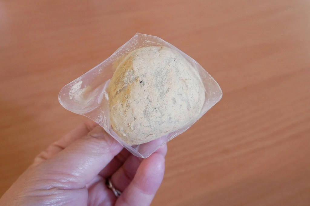麻糬就差不多跟雞蛋一樣大,外面還有灑黃豆粉…