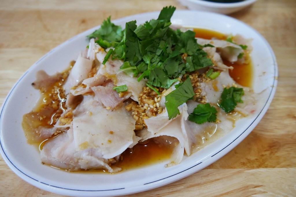 這道菜選用豬頭皮或豬頰肉,跟大薄片口感上差不多,但是這道有用火先烤過,所以味道比較重了一點,而且還有焦香氣…