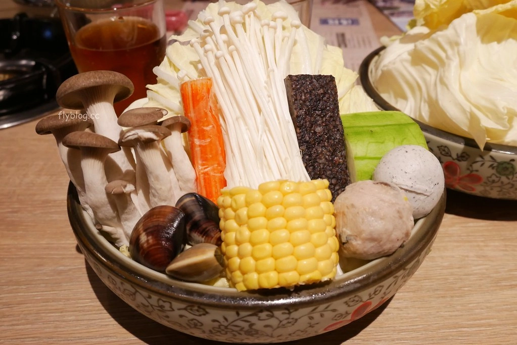 蔬菜盤 – 搭配大白菜和高麗菜,還有玉米、香菇、金針菇、絲瓜、貢丸、蛤蠣、米血和蟹肉棒…